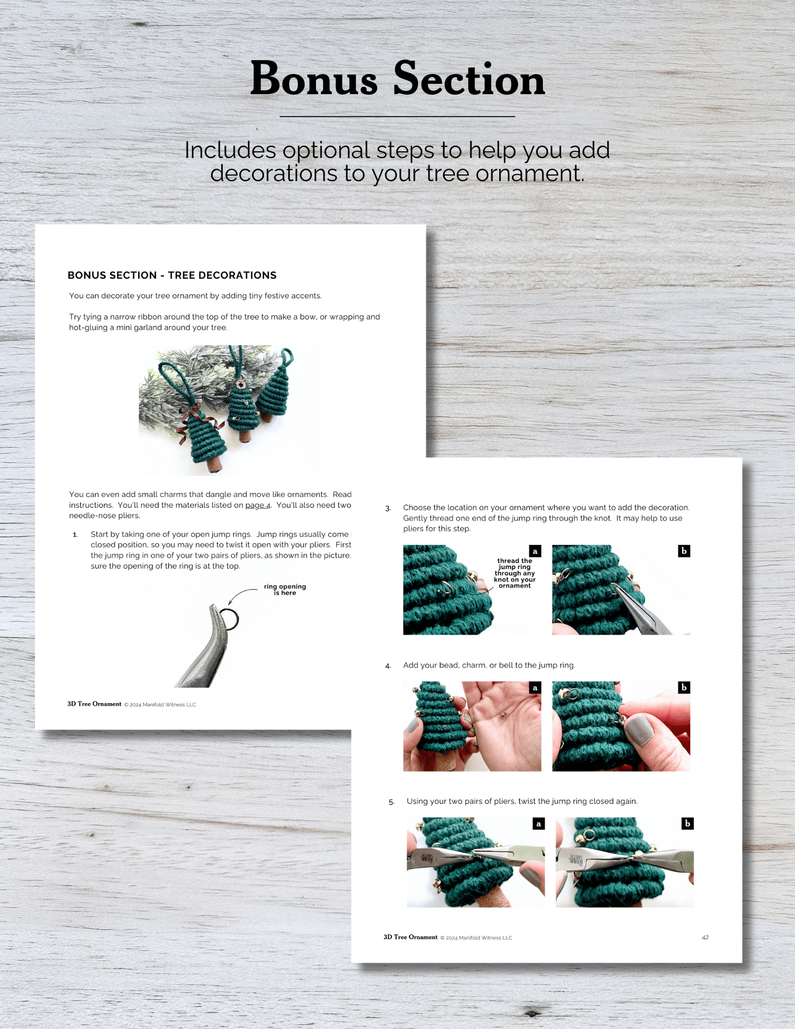 This DIY pattern is designed for beginner to intermediate skill levels. The free bonus section includes options for you to add decorations to your ornament.