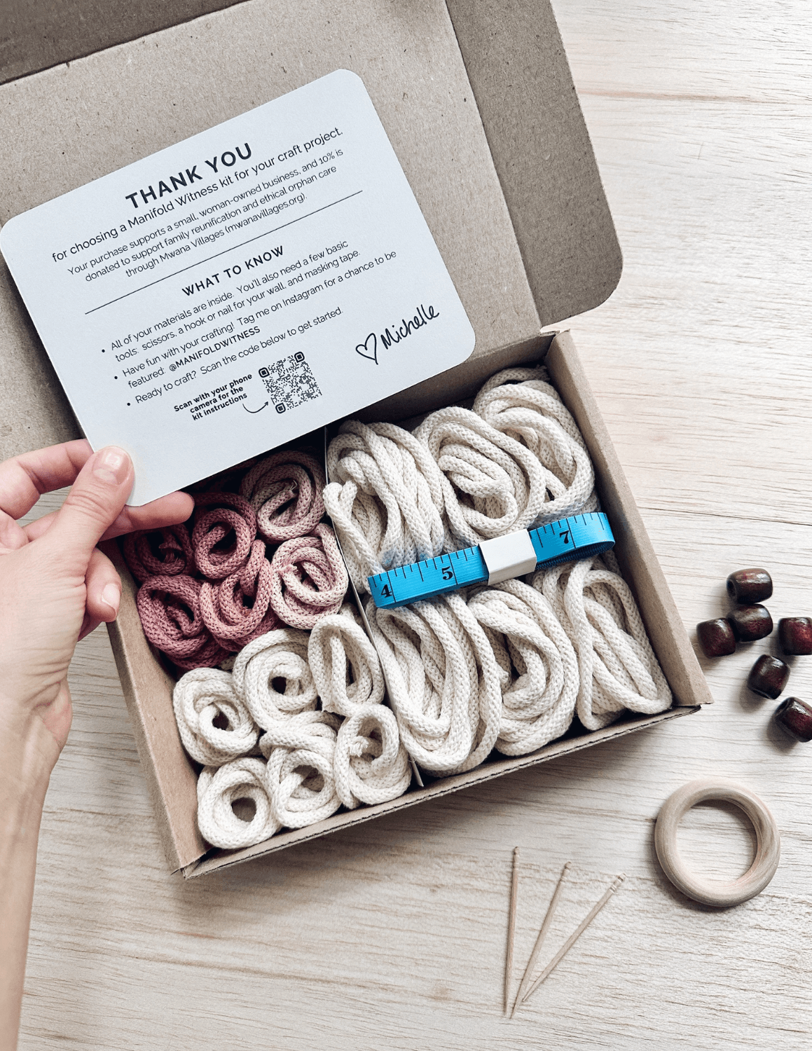 - Box includes: 100% recycled cotton cord for one plant hanger (already cut to length), one wood ring, toothpicks, and measuring tape, plus a card with QR codes to both written instructions and a video tutorial. In the interest of being earth-friendly, there are no printed instructions in the box.