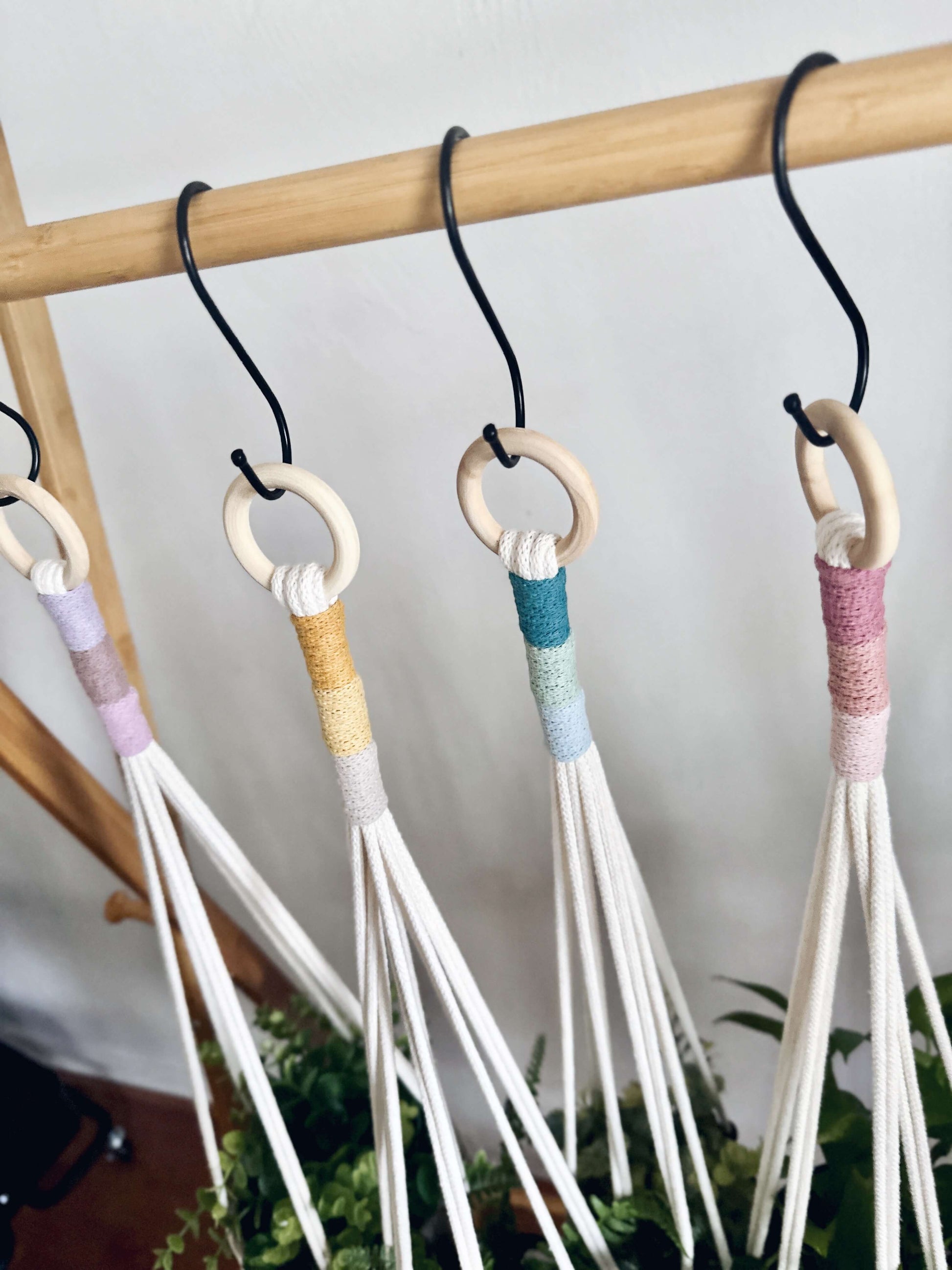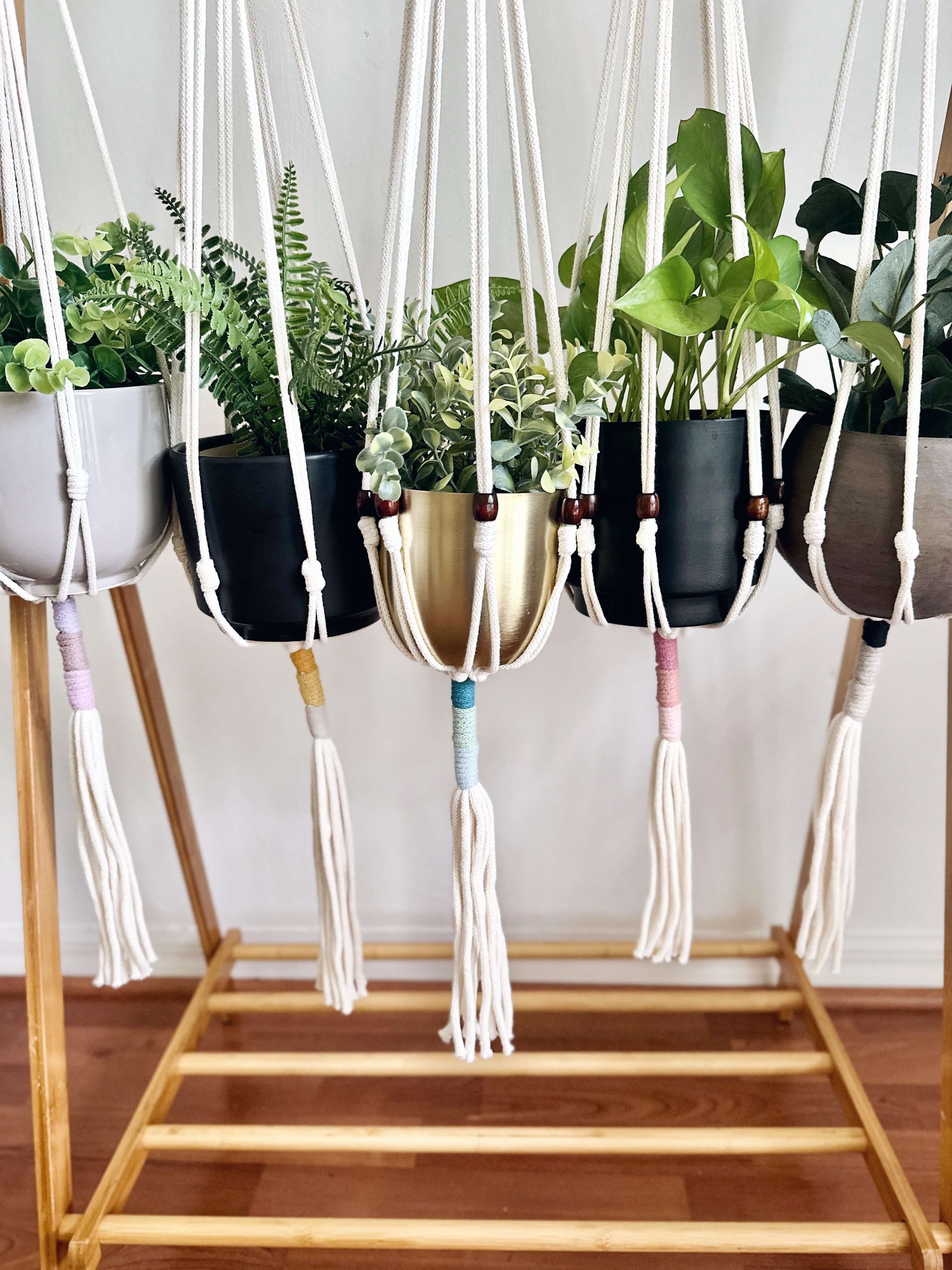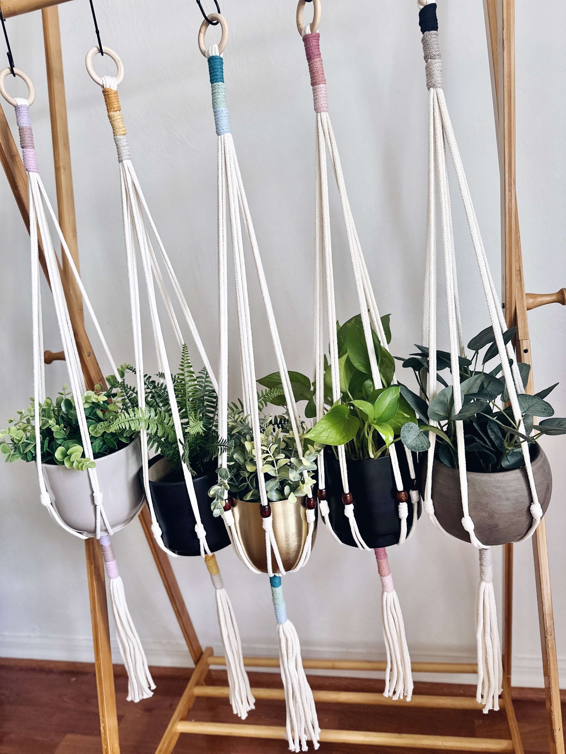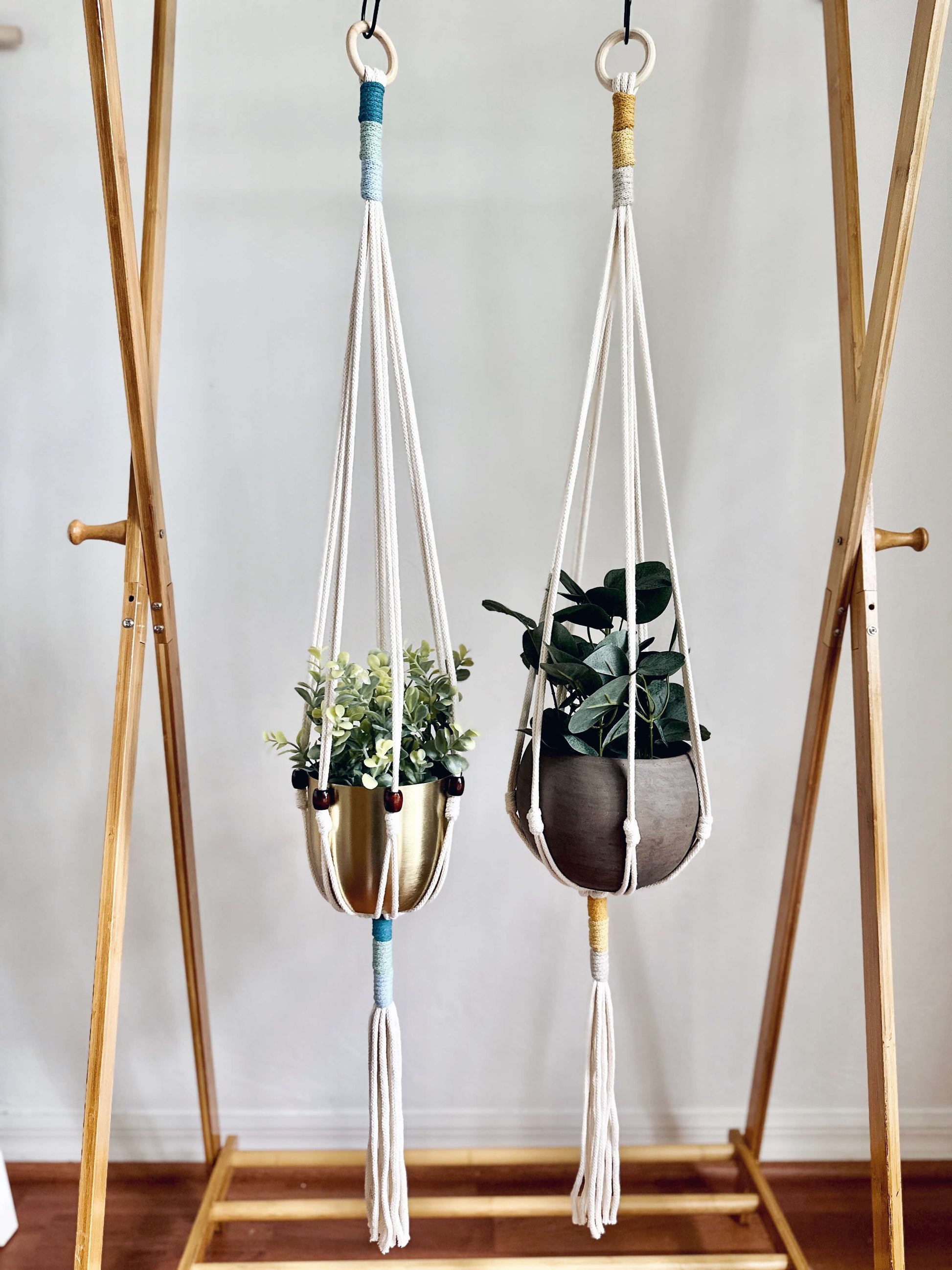 The Audrey plant hanger features a fun and colorful macrame design. Wrap knots in three coordinating shades grace the top of the piece, echoed by three more wrap knots nestled just below your plant pot. (Plant and pot not included.)