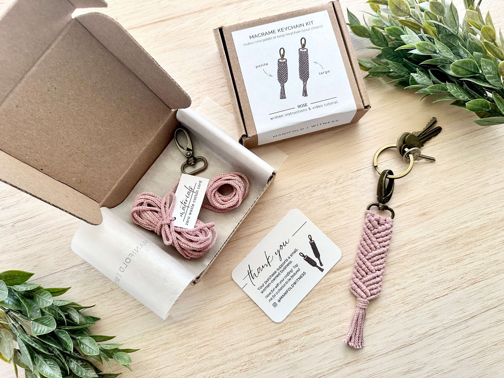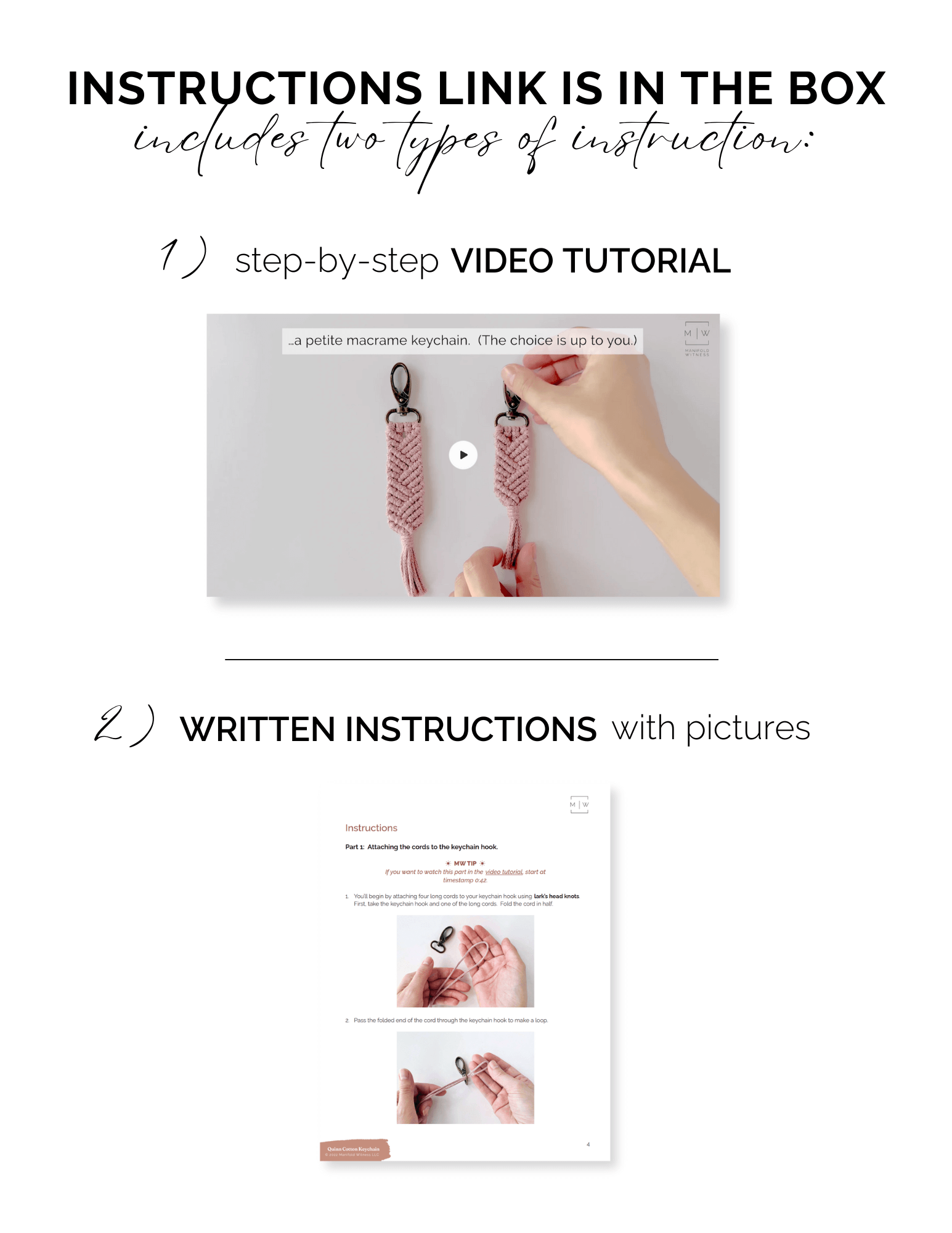 - Box includes the keychain materials, plus a card with links to both written instructions and a video tutorial. (In the interest of saving paper, there are no printed instructions in the box.)