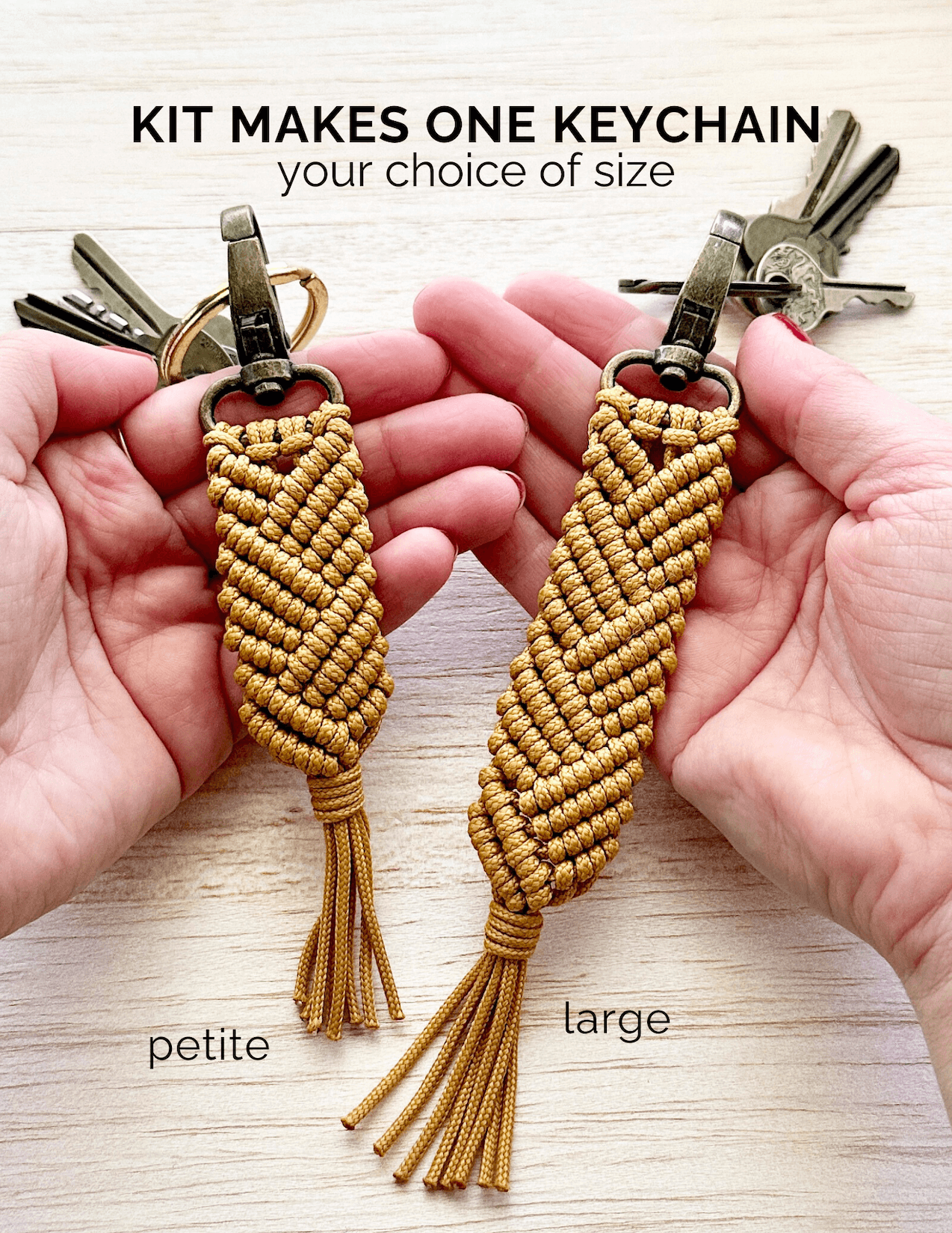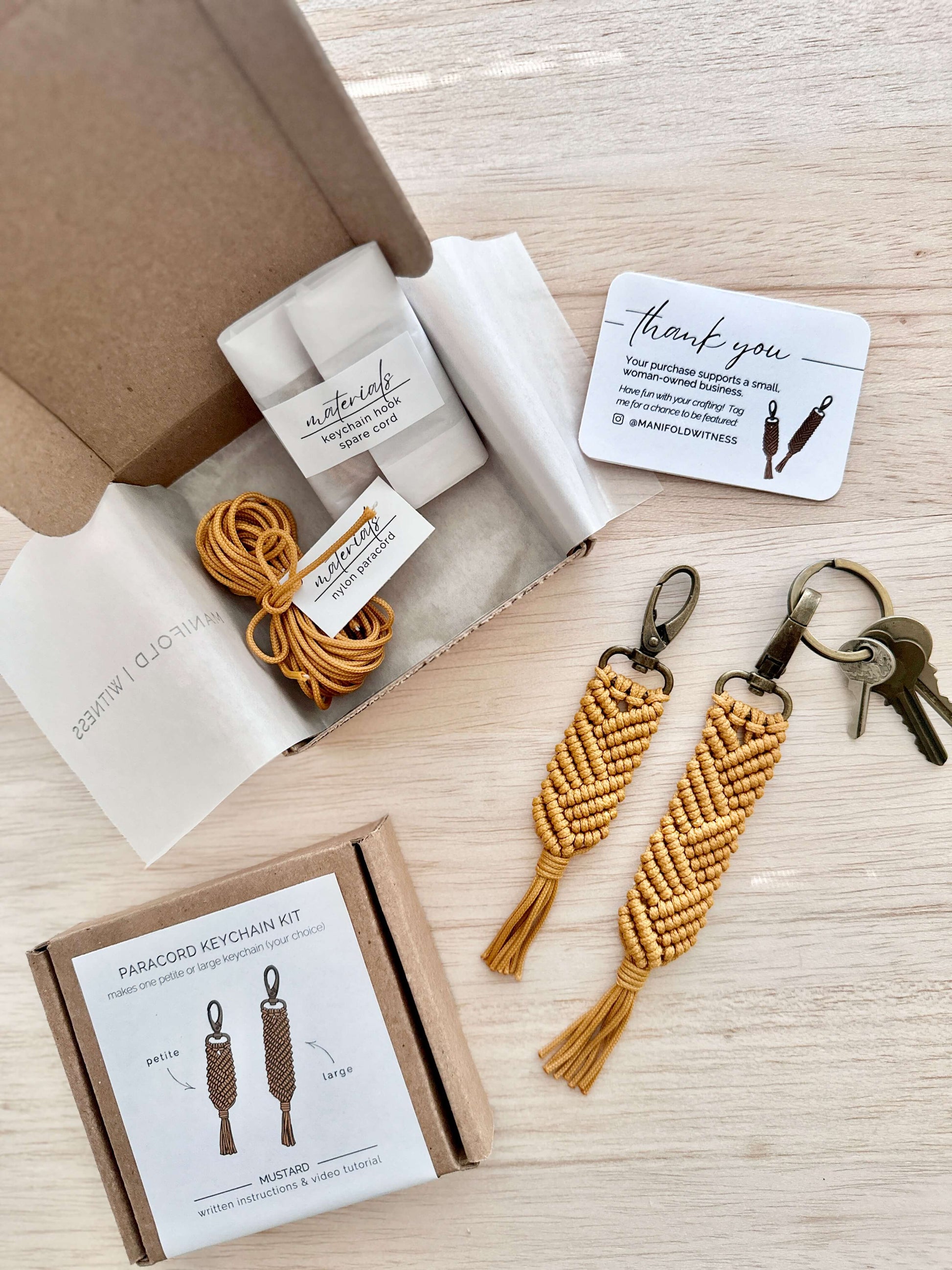 This kit comes with all the materials you will need to make your own macrame keychain from durable nylon paracord. The kit makes ONE macrame keychain - you get to choose whether you want to make the large or petite size keychain. Links to the written instructions and video tutorial are included.