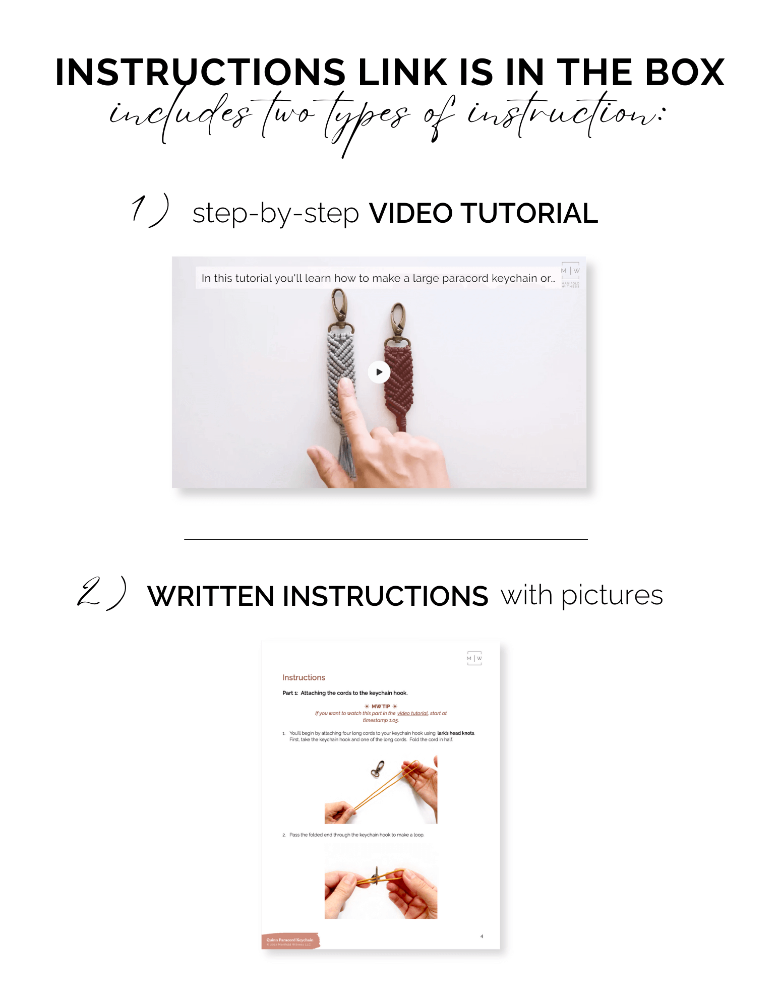 - Box includes the keychain materials, plus a card with links to both written instructions and a video tutorial. (In the interest of saving paper, there are no printed instructions in the box.)
