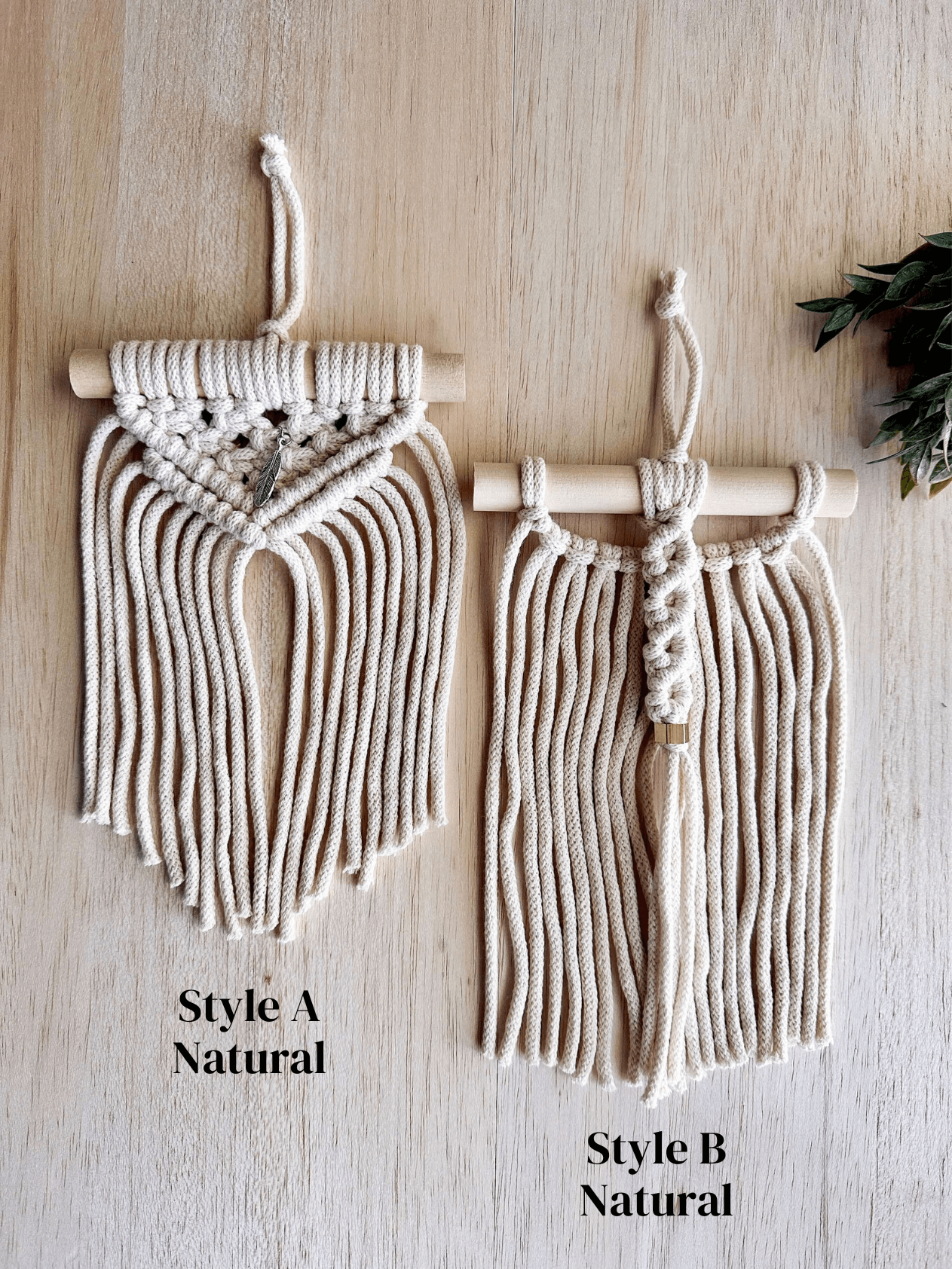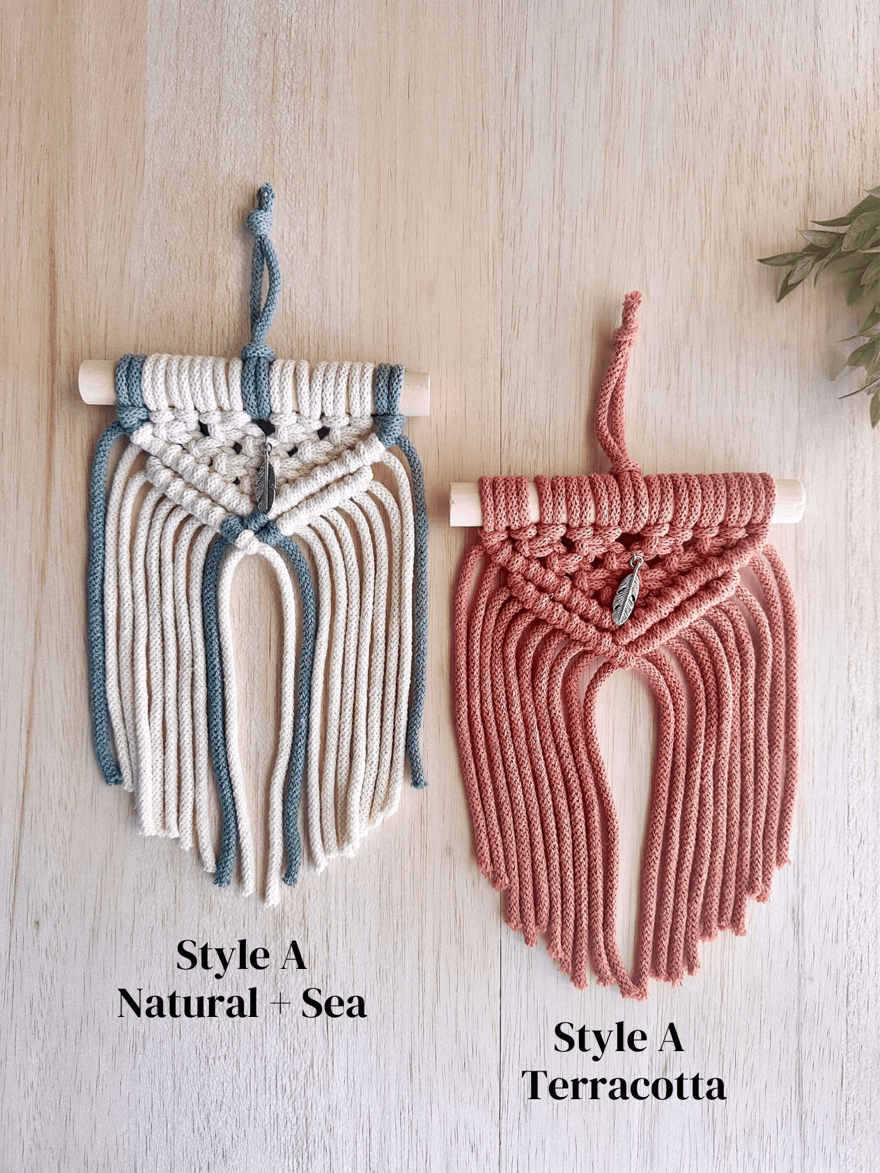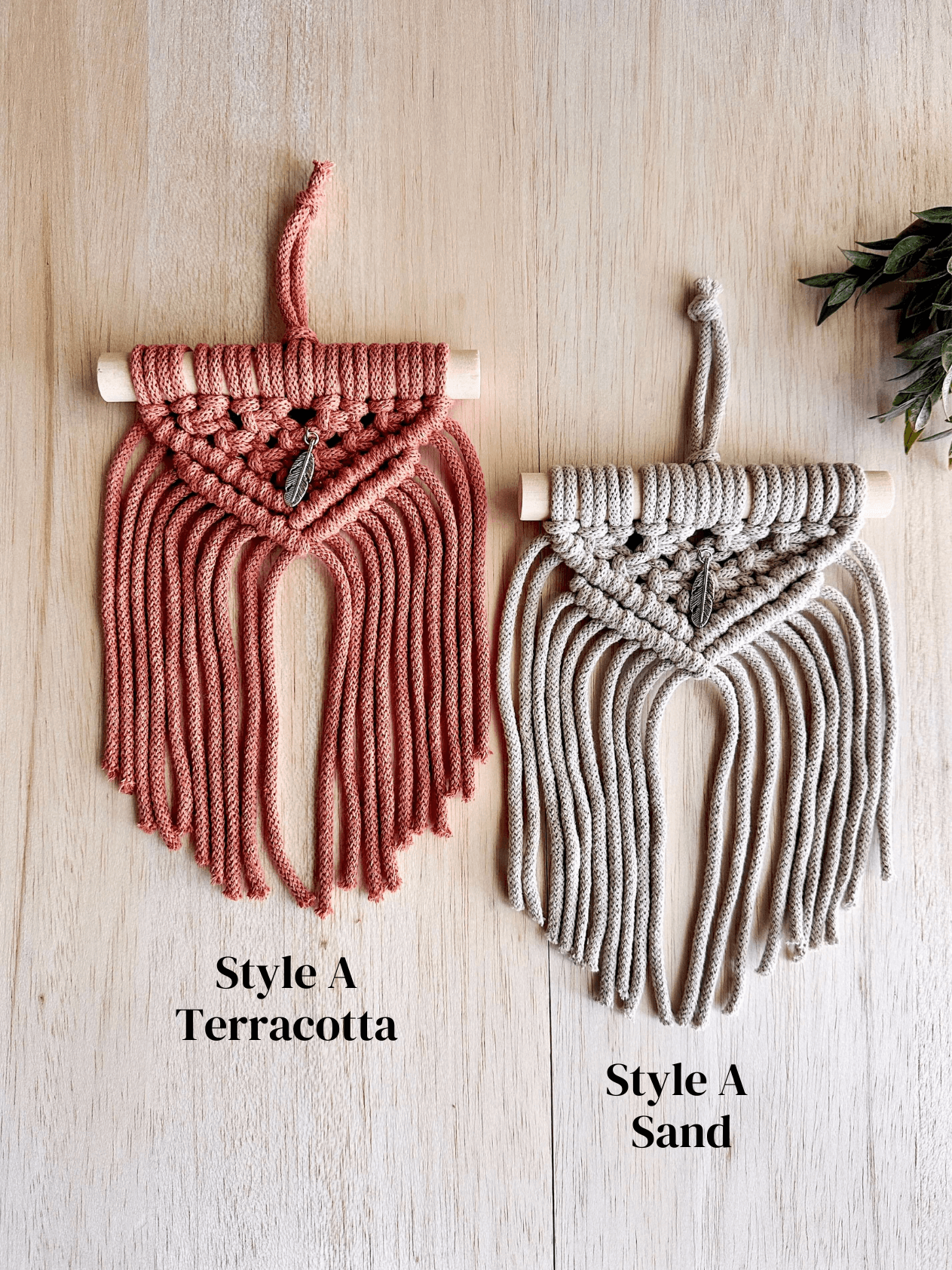 Previously available for purchase only at my in-person events, these petite wall hangings are now available for the first time through my online shop. They’re hand-crafted from braided 5mm cotton cord, a natural birch wood dowel, and either a silvertone feather charm (style A) or a brass accent bead (style B).