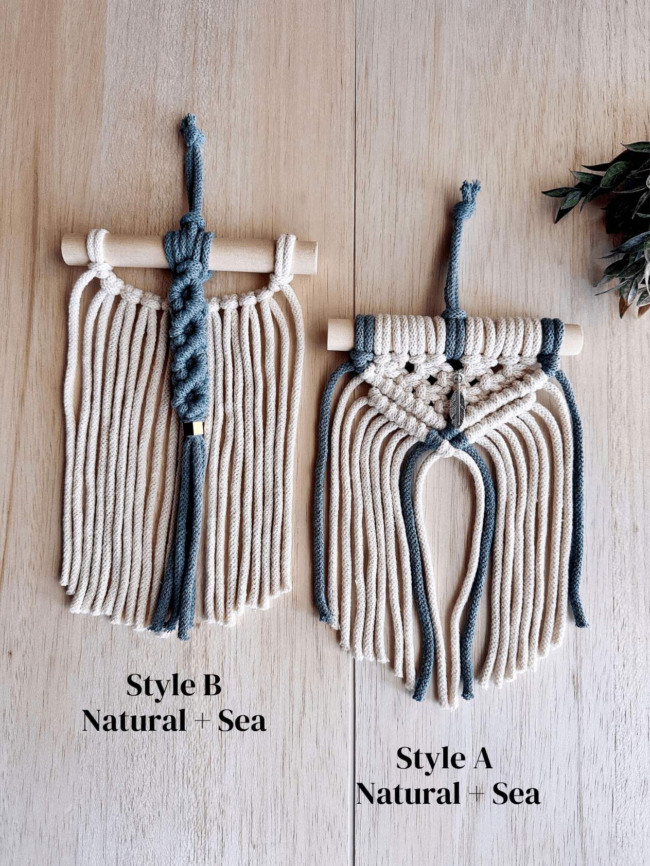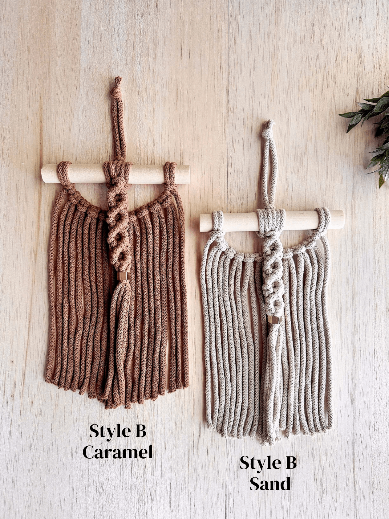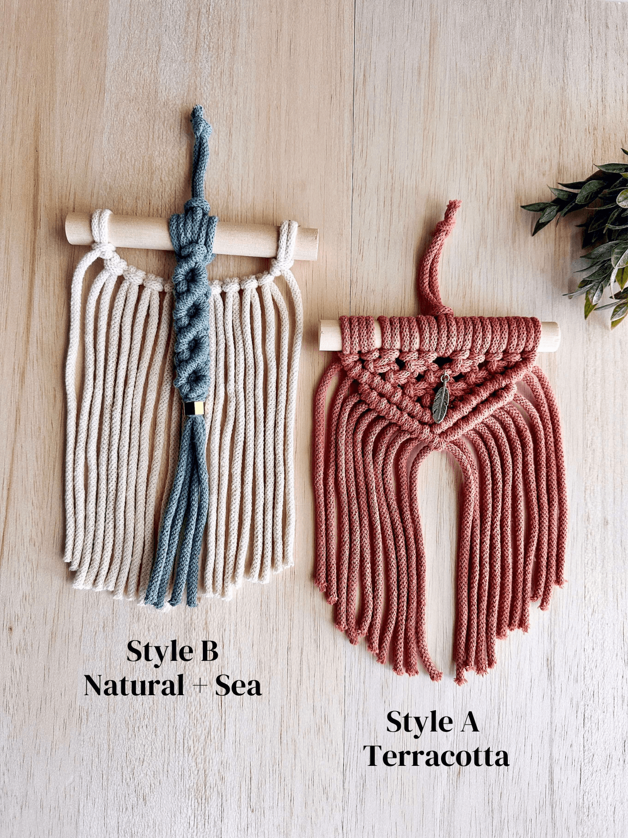 Previously available for purchase only at my in-person events, these petite wall hangings are now available for the first time through my online shop. They’re hand-crafted from braided 5mm cotton cord, a natural birch wood dowel, and either a silvertone feather charm (style A) or a brass accent bead (style B).