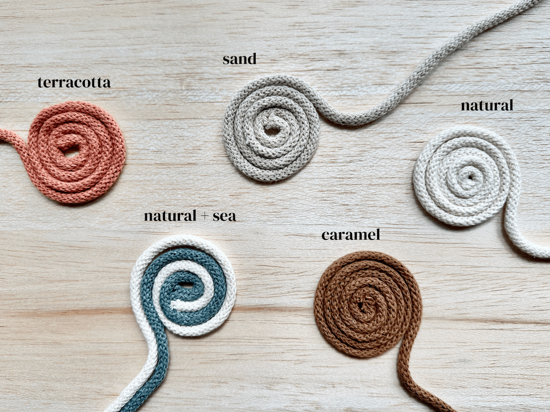 - Materials: 100% recycled cotton cord (OEKO-TEX certified non-toxic), natural birch wood dowel, metal feather charm in silvertone finish (style A only), hexagonal brass bead (style B only).