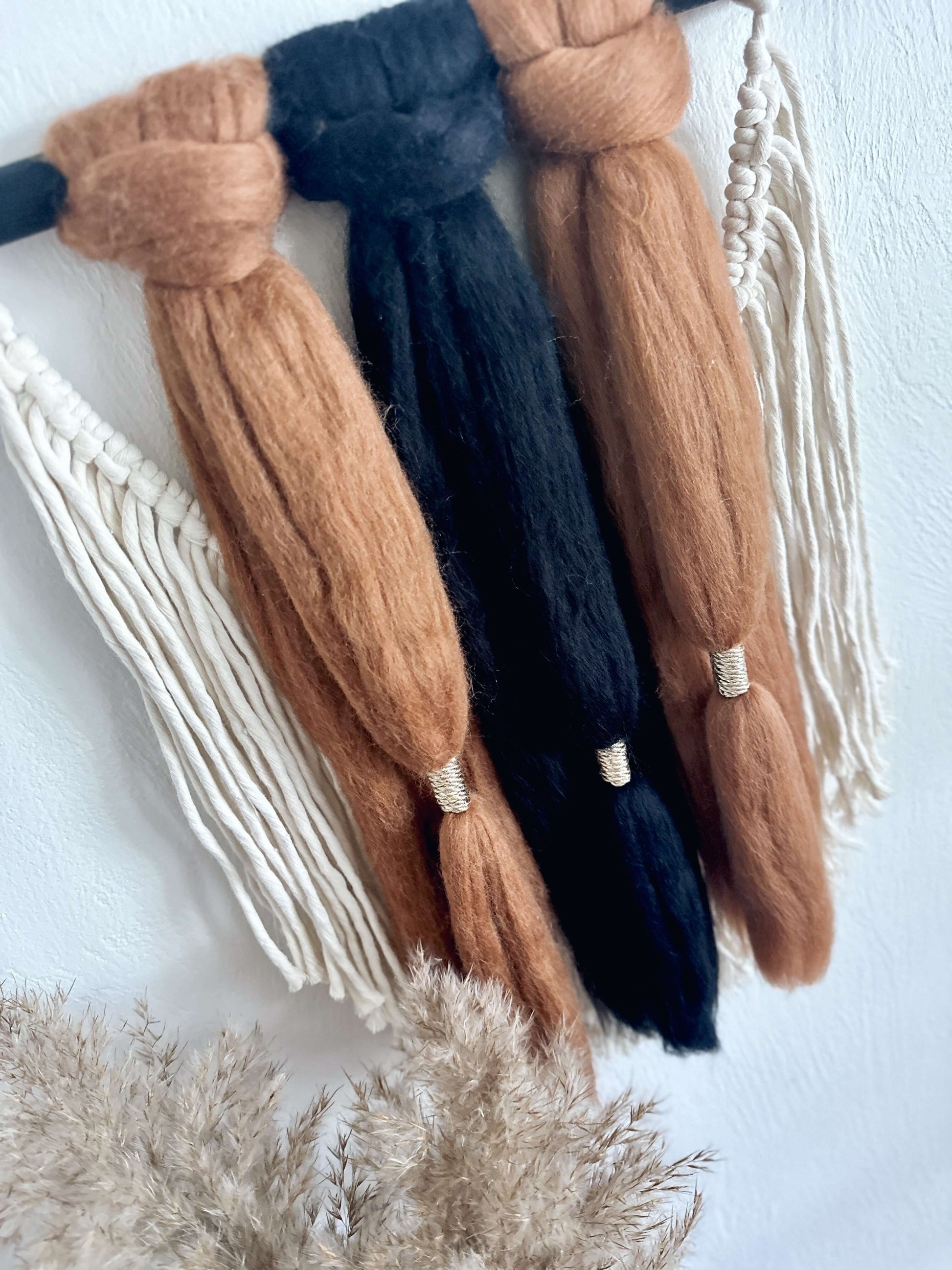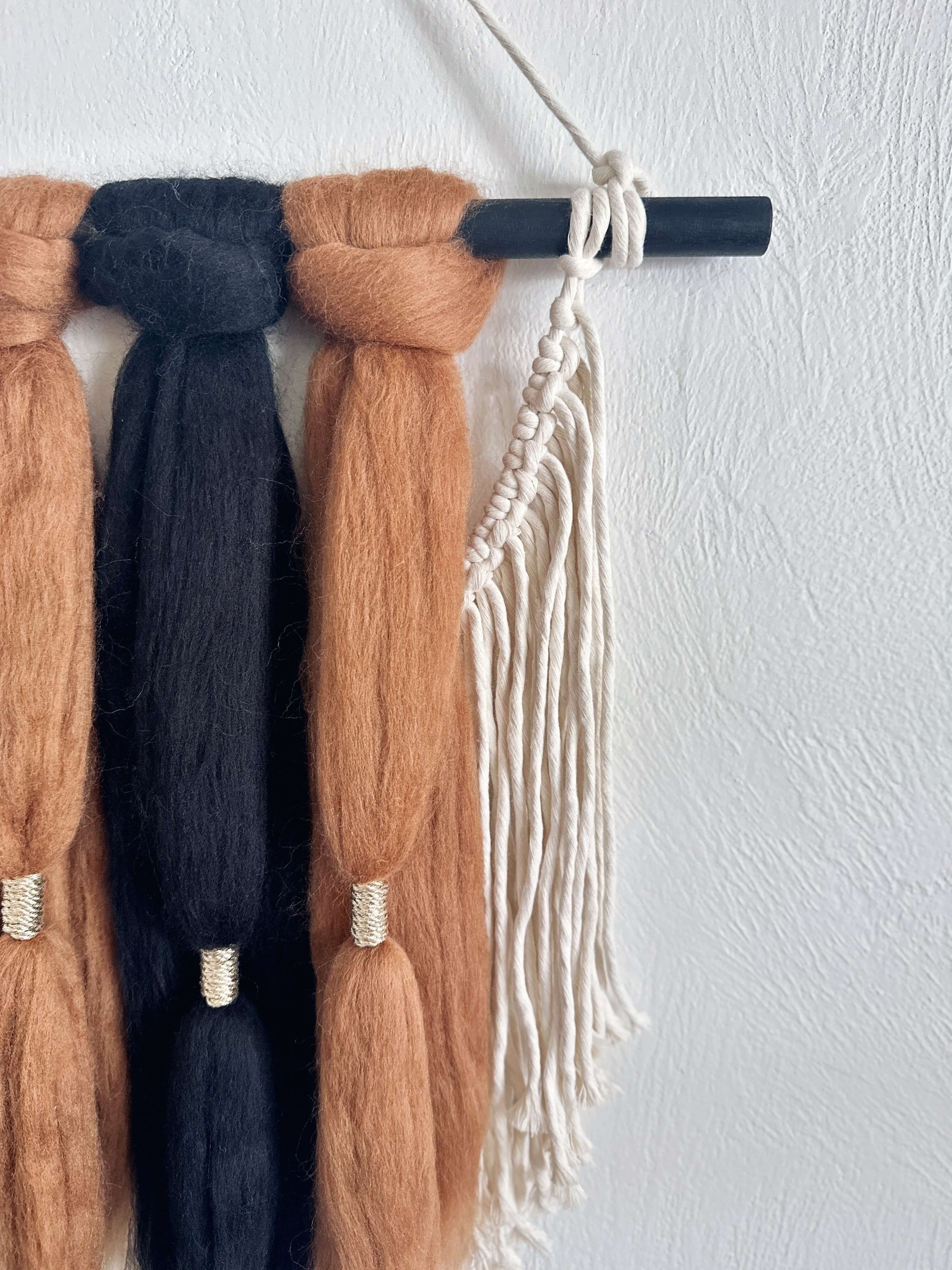 - Materials: natural birch wood dowel, ethically-sourced merino wool from non-mulesed flocks, recycled cotton macrame cord, and metallic macrame cord in gold.