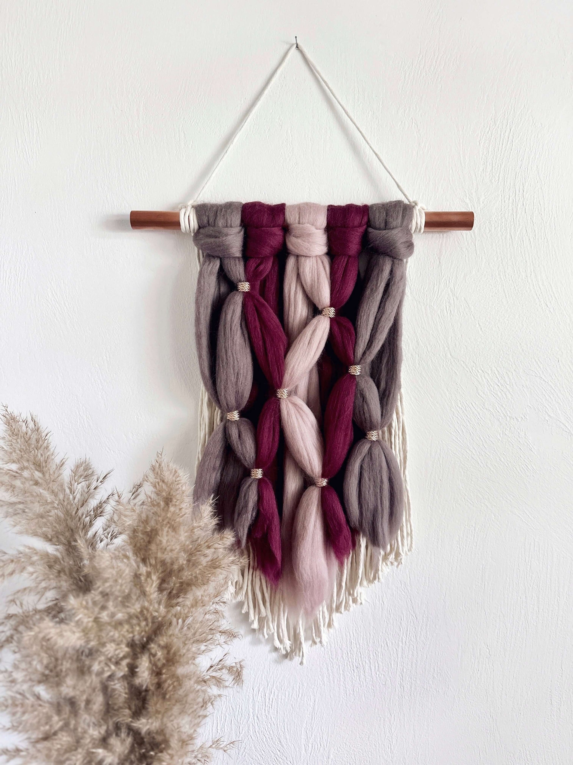 - Color palette: pewter, burgundy, and mink (rosy mauve), with macrame layer in natural.