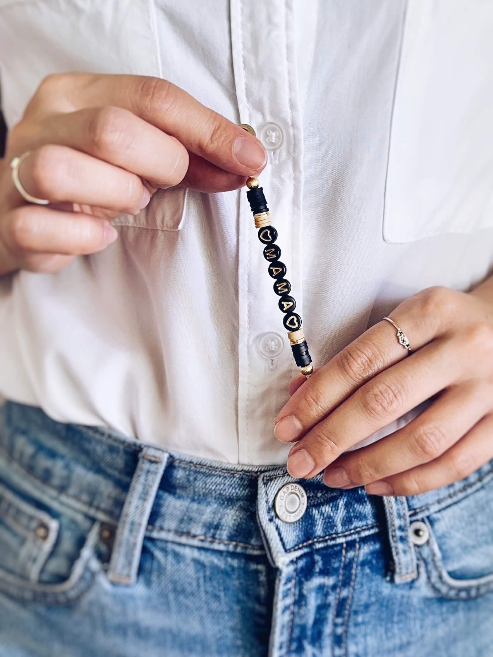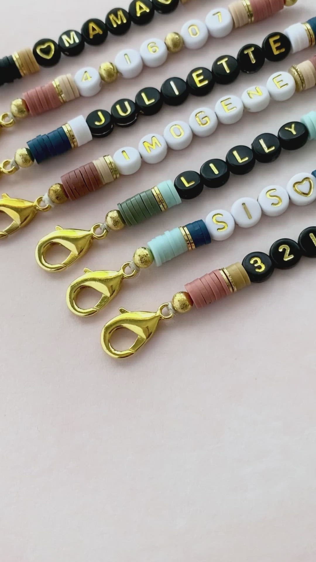 - Crafted from waxed linen cord, gold plated disc beads and sphere beads, vinyl heishi beads, acrylic letter/number beads, and a metal alloy clasp in a gold finish.
