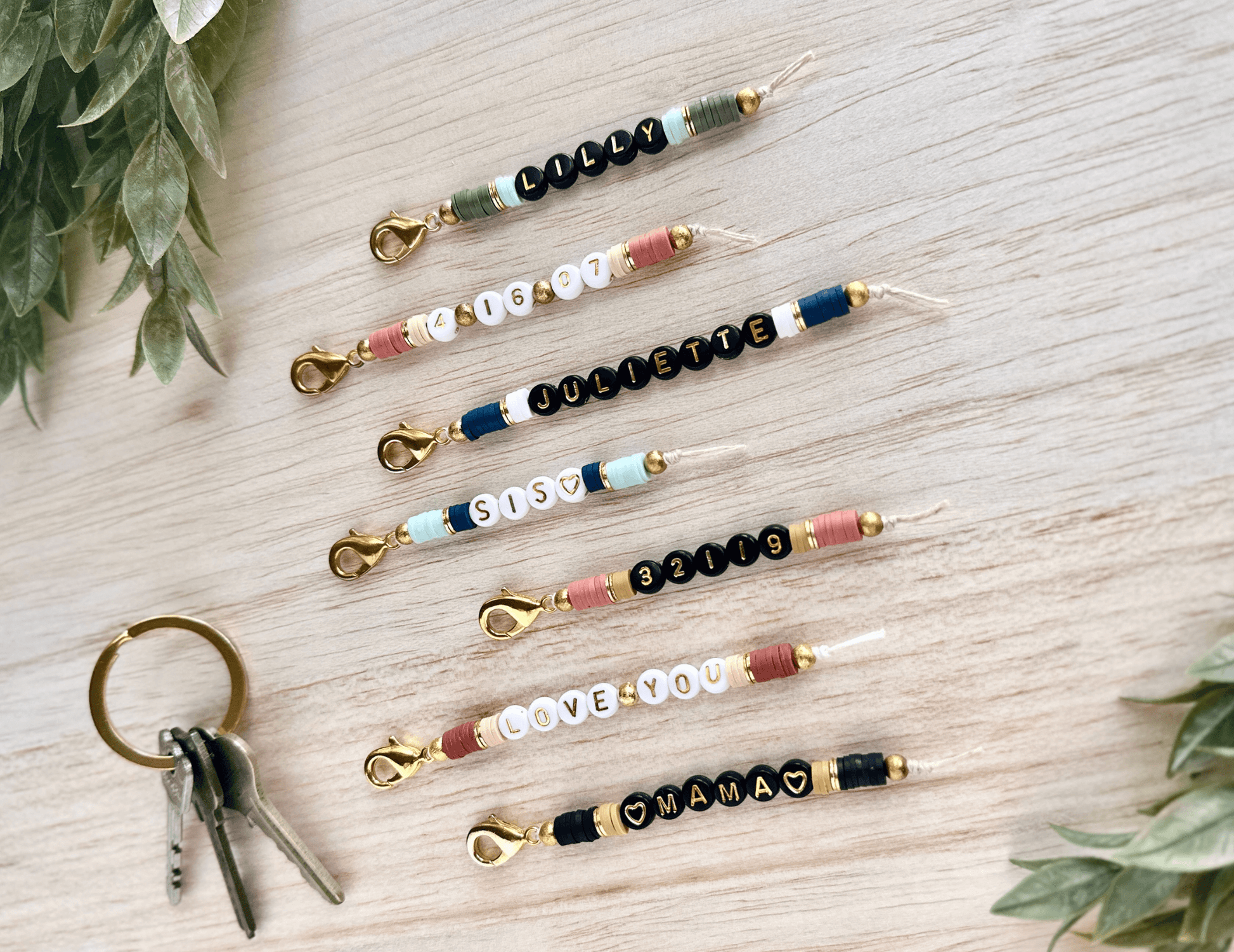 - Choose a name, initials, a special date or zip code, or a meaningful word to add to your personalized keychain. If you type multiple words and leave a space between them, I will add a round spacer bead between the words when I make your keychain.