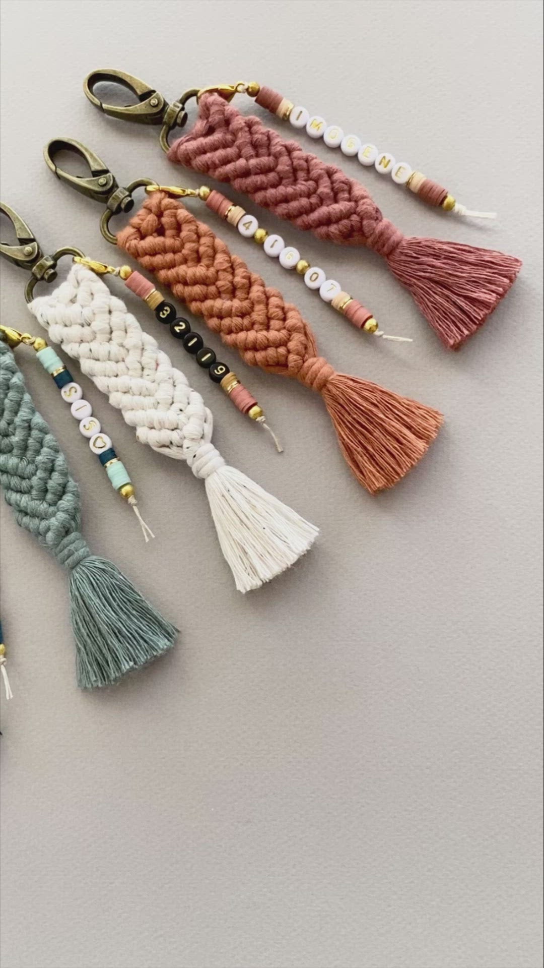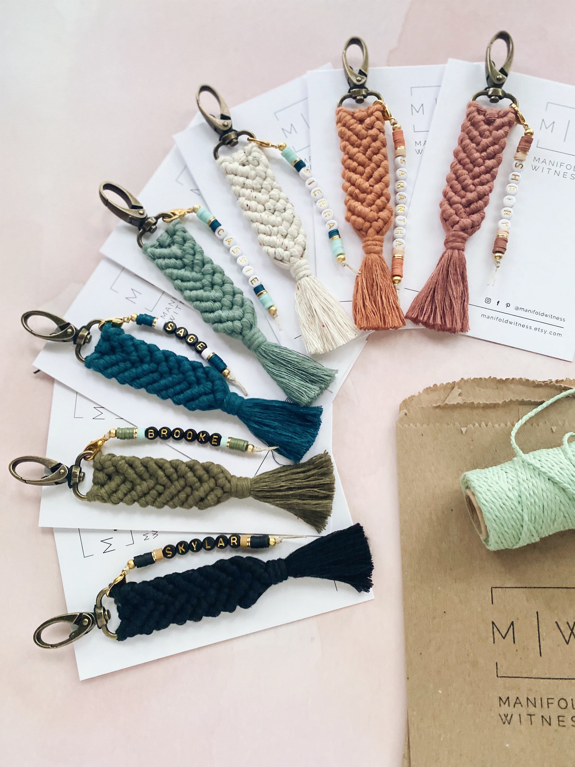 - Matching beaded name charm that clips onto the macrame keychain.